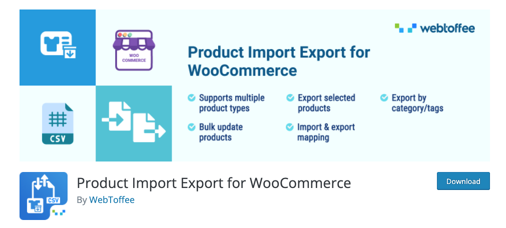 Importing products in the eCommerce store is another vital functionality. Using the Product Import for Woocomemrce Plugin, you can export and import all simple, grouped, and external/affiliate products to and from CSV. It also works well with Yoast and the All in All SEO plugin. You can install this free plugin from WordPress official plugin directory.