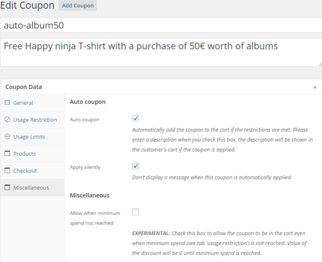 WooCommerce Extended Coupon Features FREE is a plugin that adds extra options to WooCommerce coupons and allows you to set automatic discount rules.