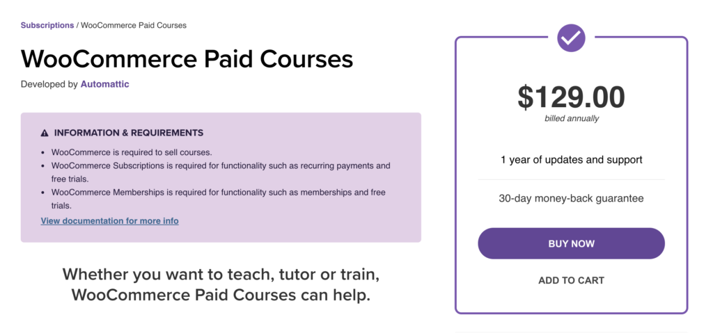WooCommerce Paid Courses is the payment extension for the sale of online courses, that is, to create an online academy and offer training. It is also known as “Sensei pro” as it is the premium version of Sensei LMS, the WordPress plugin for creating courses, lessons, and quizzes.
