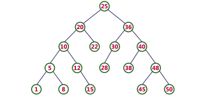 নিচে একটি চিত্রের মাধ্যমে একটি বাইনারি সার্চ ট্রি বোঝানোর চেস্টা করেছি। চিত্রটি খেয়াল করলে দেখবে যে, রুট নোডে আছে ২৫, আর এর বামের সাবট্রি গুলোর মান এই ২৫, মানে রুট নোডের মান থেকে ছোট আছে। আবার ডান দিকের সাবট্রি গুলোর মান রুট নোড এর মান ২৫ থেকে বড় আছে। অর্থাৎ কোনো নোডের বাম দিকের সব মান ঐ নোডের মান থেকে ছোট, আর ডান দিকের সব মান বড়।