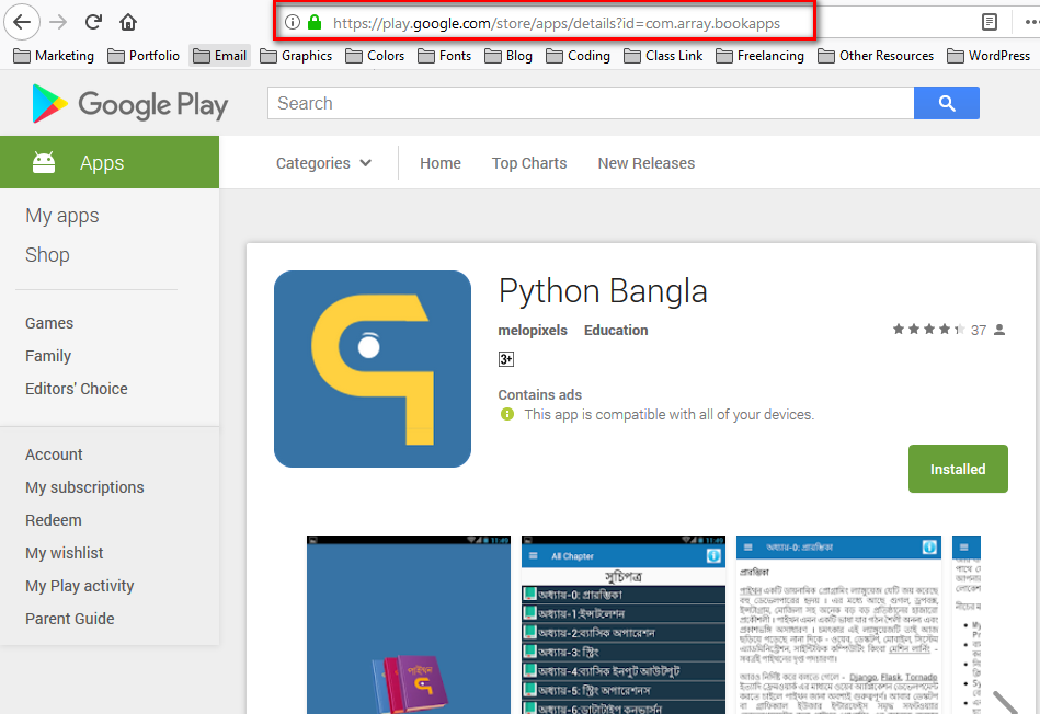 এখানে এই পাইথন বাংলা অ্যাপের আইডি হচ্ছে “com.array.bookapps”, অর্থাৎ https://play.google.com/store/apps/details?id= এর পরে যা থাকছে তাই হচ্ছে আপনার অ্যাপ এর আইডি।