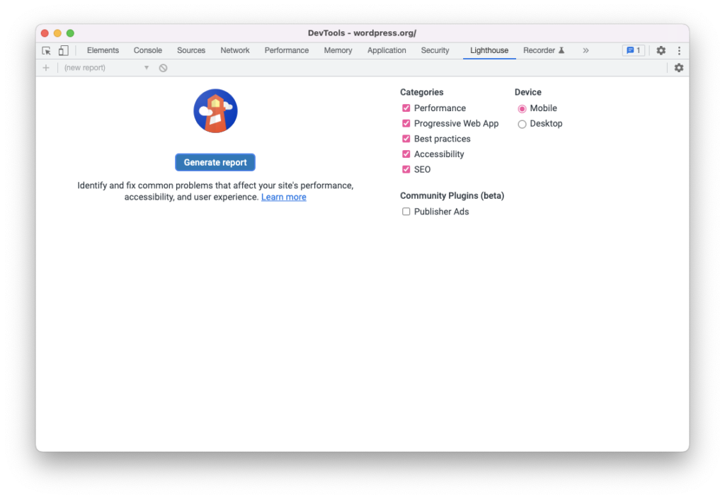 PageSpeed Insights will include the Lighthouse performance audit; also, you can test both mobile and desktop at once, view real-world data from Google, and see more diagnostic tips to improve the per.