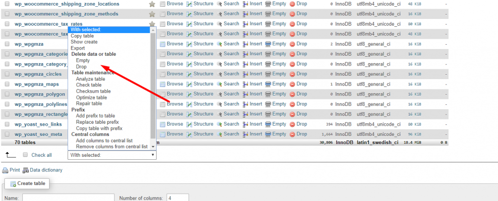 Now scroll down and you will see a selection option. Click on it and many option will be visible to you. Now you may click on “Drop” to delete and “Empty” to clear the table value as shown above.