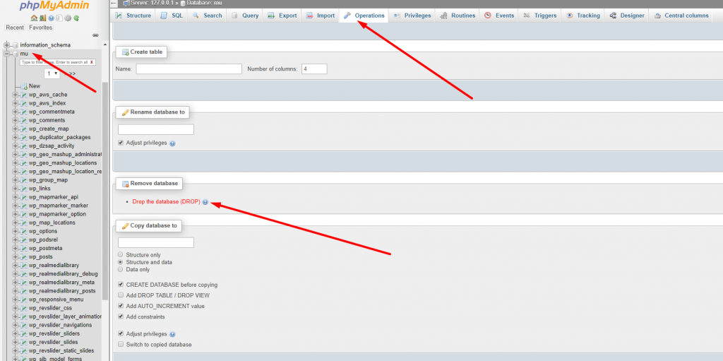 First click on the database you want to delete from the left panel, where all of your created database has been listed. Once you click on the database name, it will be open and a new menu item will be loaded at the top. From the Top menu, click on “Operations” link as shown above. Once operations tab has been open, scroll down and you will see “Drop the database” in red letter. Click on it to delete entire database.