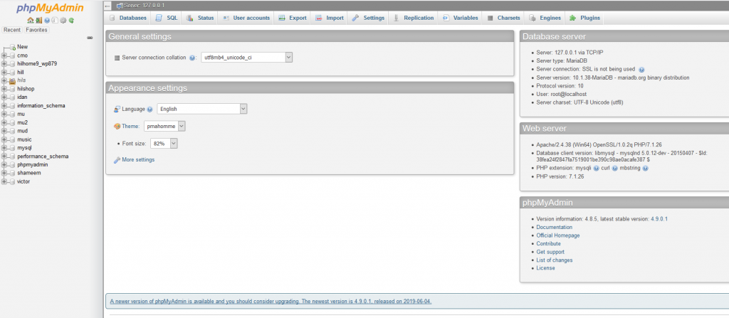 STEP 1: First of all, open XAMPP or WAMP control panel and start Apache and MySQL. Once both run (it will be mark as green) open your browser and go to localhost/phpmyadmin. Your PHP my admin dashboard should look like the bellow image: