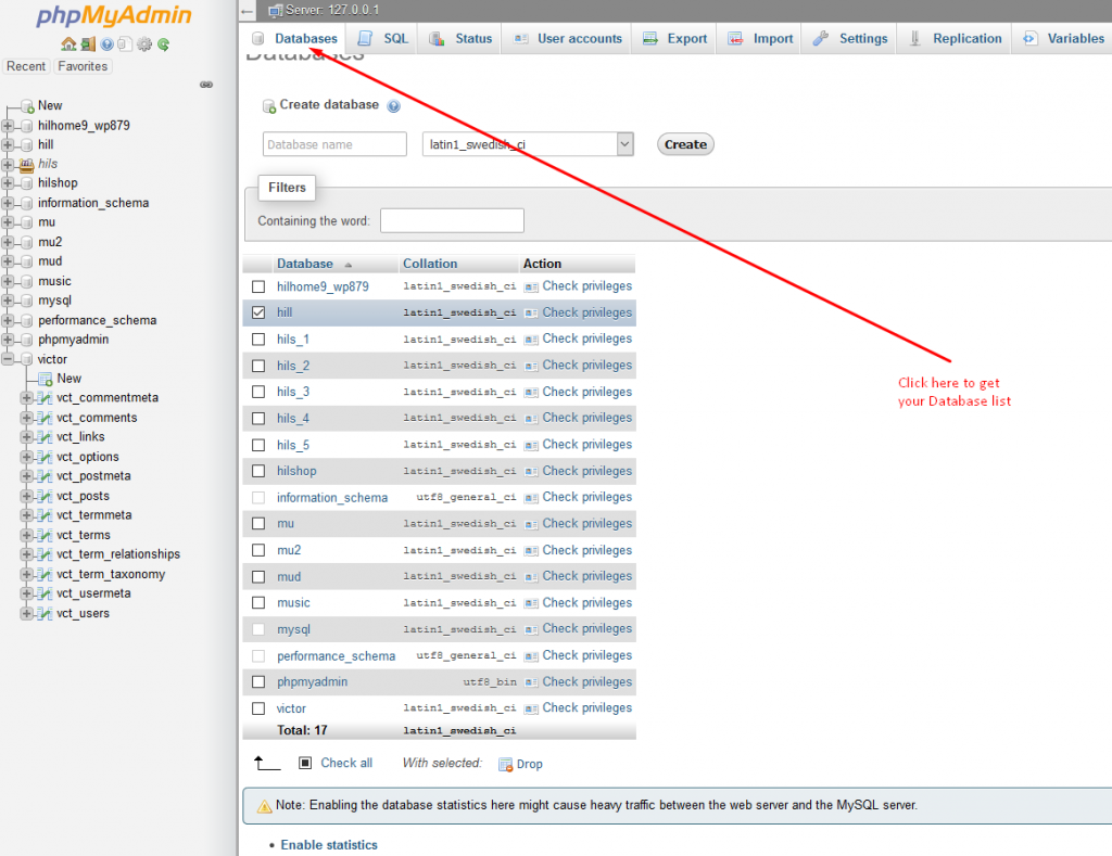 STEP 3: Now chose which database you want to delete from your phpMyAdmin. Actually there are two ways to delete. First lets see the easiest way to delete database using phpMyAdmin in XAMMP/WAMPP.