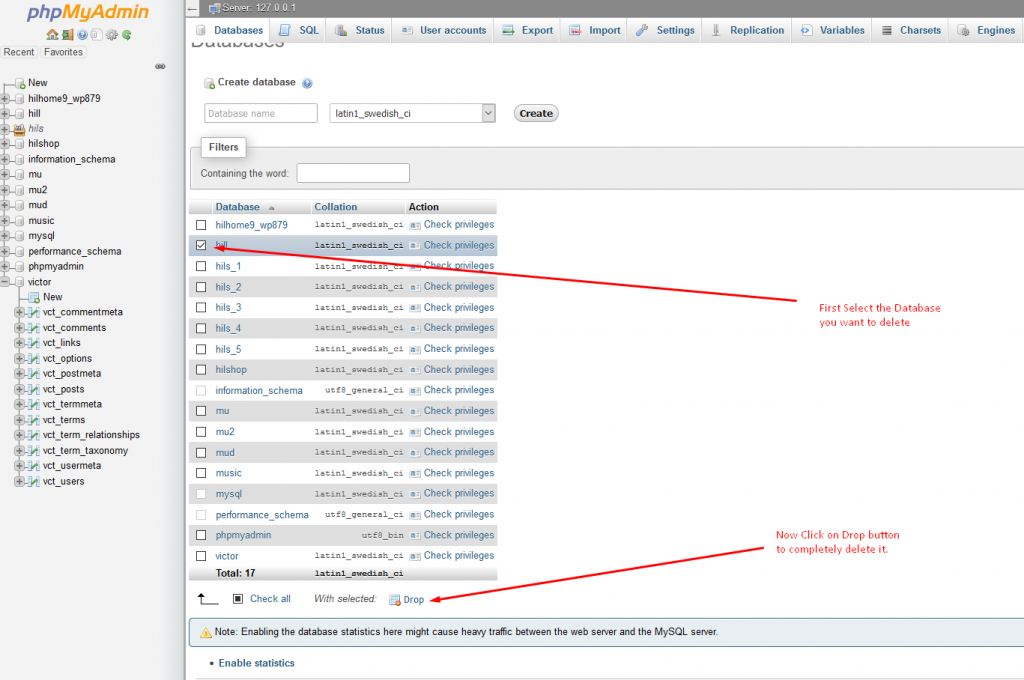 As I told earlier, its not so hard to delete database from phpmyadmin. You can delete any database, or database field by following these easy to follow step guide: