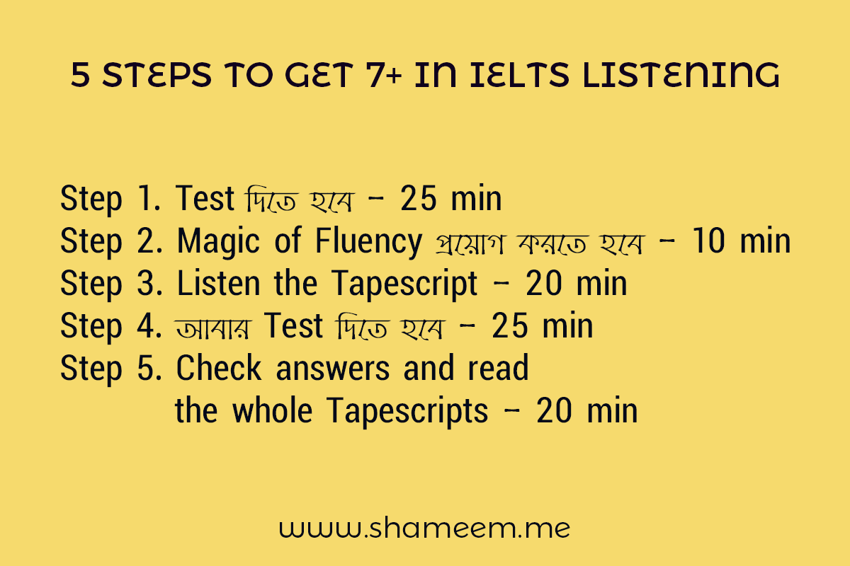 ৩। টেপস্ক্রিপ্ট শুনুনঃ ম্যাজিক অফ ফ্লুয়েন্সি প্রয়োগ করার পর, টেপস্ক্রিপ্ট মনোযোগ দিয়ে শুনবেন। এখানে কিন্তু পড়া যাবে না। আর শোনার সময় আপনি যে কাটা কাটি গুলো করেছিলেন, তা মিলিয়ে নিবেন। আর এই শোনার জন্য আপনার সর্বোচ্চ ২০ মিনিট সময় লাগবে, কেননা এক্সাম্পল বা ফাকা অংশ সব তো আগেই কেটে দিবেন।