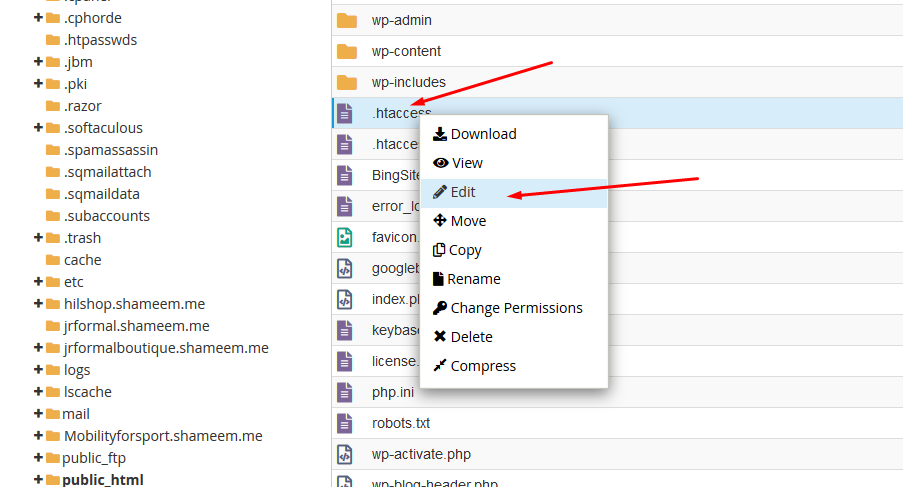 - Once you enable the show hidden files options, you will see the .htaccess file in the file list. You need to option the .htaccess file on the editor as shown below.
