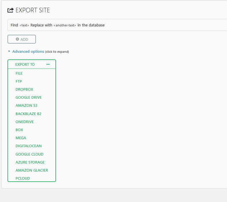 You can export the whole website backup in any way, such as direct download, storing in Dropbox, Google Drive, etc. You will also get the same options when you import the backup.