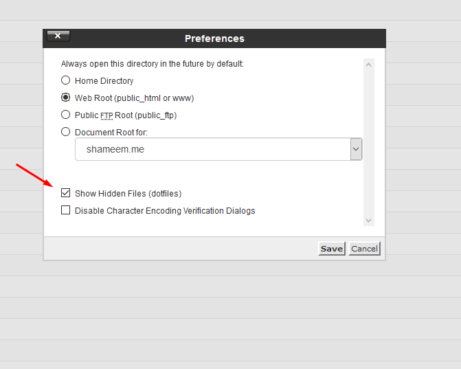 - Now click on File Manager to open the website root. Note that you must need to enable showing hidden files in the file manager.