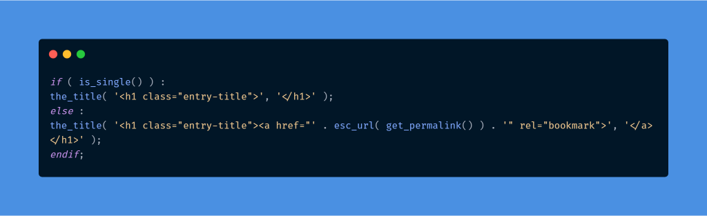 The IF statement contains is_single(). This is a function that returns ‘true ‘if you are looking at a single “single post page” entry page, otherwise you will return ’false’. When it is true, and we are on a single page, we use the_title() function to issue the title.