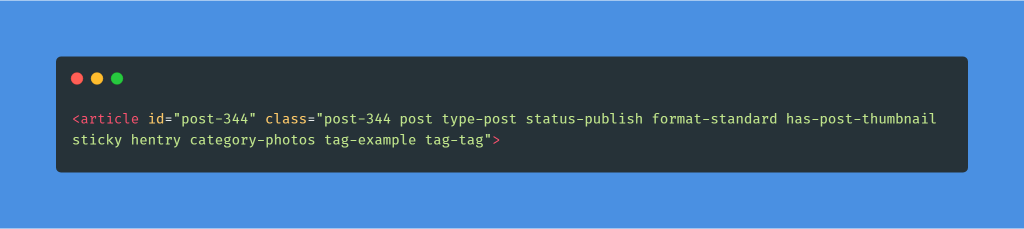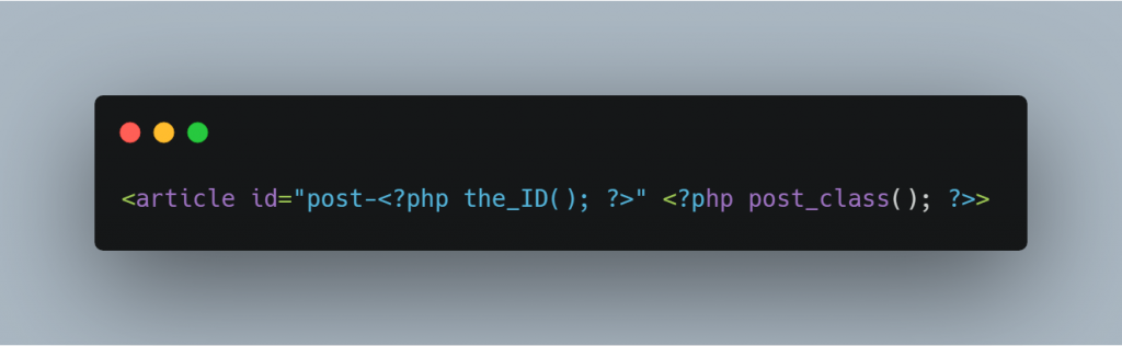 We can understand from the comparison that the_id() function is replaced by the ID of the article in question. The post_class () function adds a lot of classes for the HTML element. These help us to stylize our entrances later on. It is not important at this stage to know why these specific classes are added, We are only becoming familiar with functions.