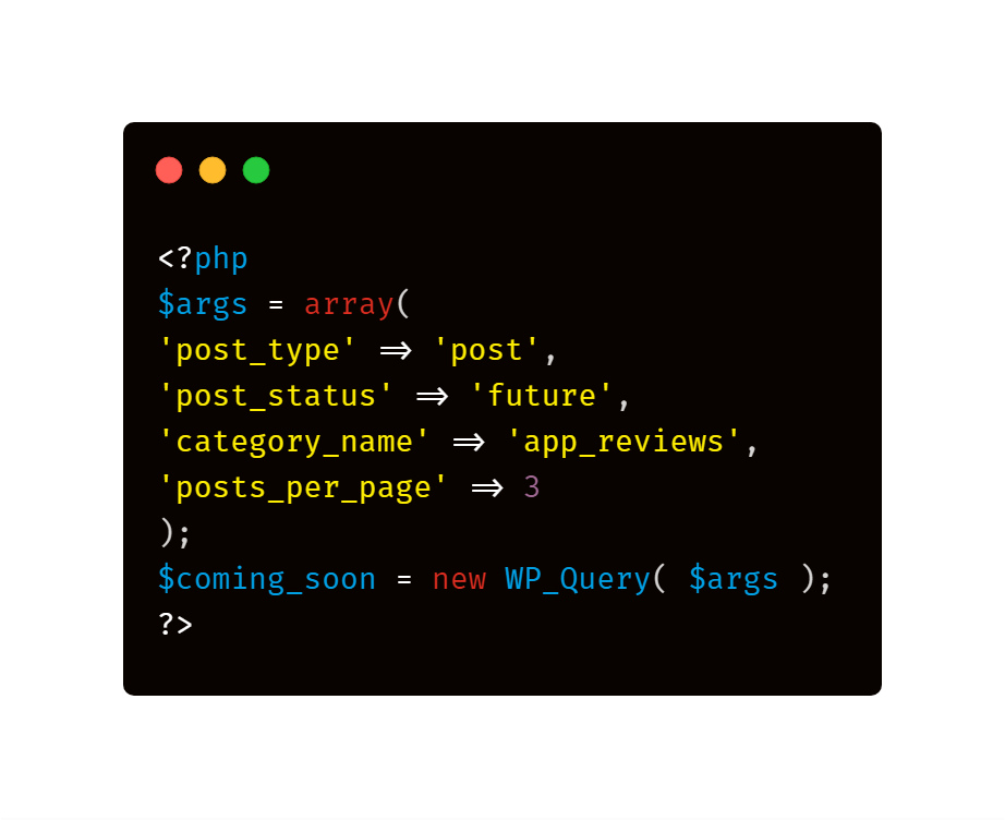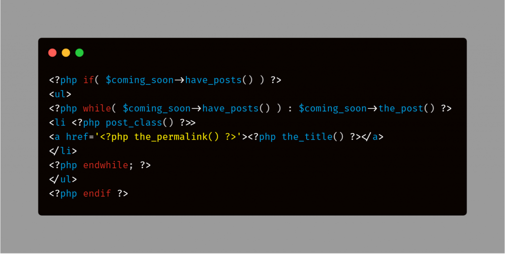 Now that we have a custom query we can use a custom loop to display the content. All we need to do is add the have_posts() and the_post() prefix that works with the name of the variable that contains the query and an ” arrow”: