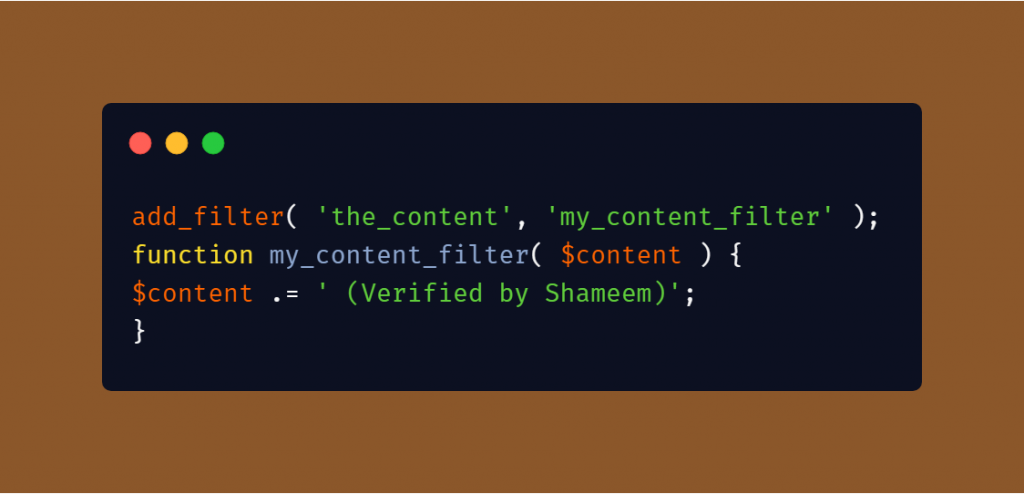 To show how filters work, we will modify the content of a post with one. The_content () filter runs before it displays the content of a post. We use a hook to tie a function so we can modify it.