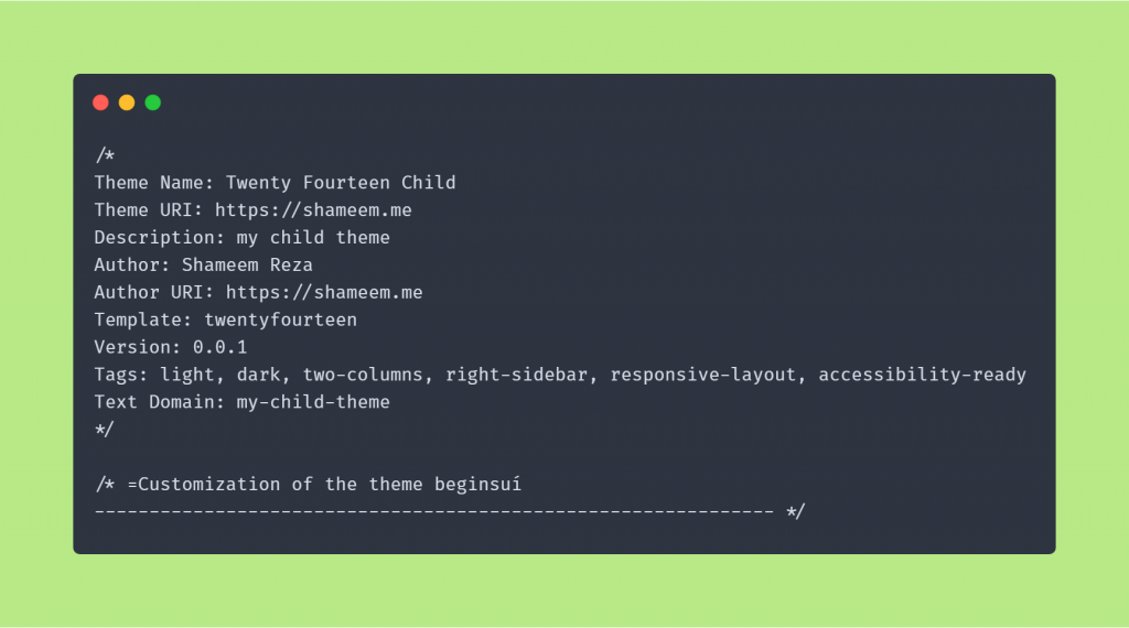 Creating a child theme is a child’s play. You just need to create a new folder in the themes directory and the name you want to give it. For our example, we will create a folder called “child-theme”. Inside this folder we create two files; style.css and functions.php. Open the style sheet and use the following to create the child theme: