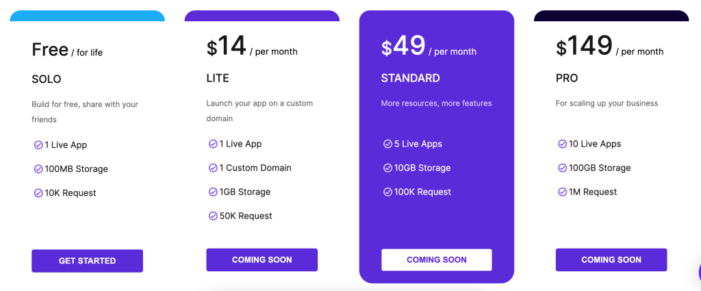 Code2.io has four pricing packages, one is free for a lifetime, but the limitation is, you only can create one web application.