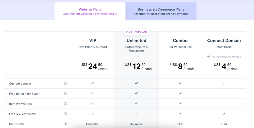 Wix has various pricing plans for Website plans to create personal or blog websites and Ecommerce or Business websites.