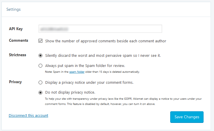 - Navigate to Settings -> Akismet