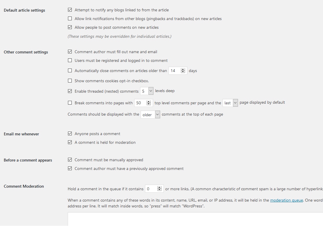 Now its time to check WordPress default Comment settings. Depending on your site you can escape few settings as I used for mine.