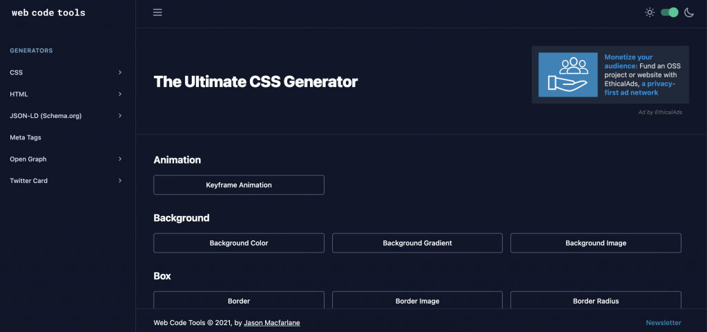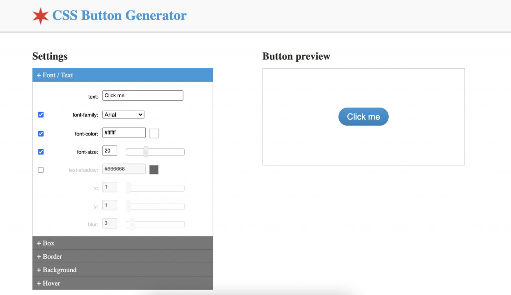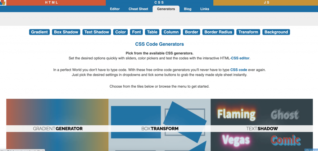 Web Code Tools is a website that offers CSS code generation of many elements in CSS, after giving certain attributes to create your custom button, text, tags and more.