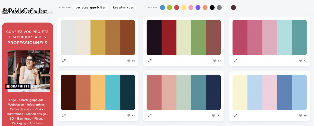 Are you looking for a coherent graphic charter for your new project? Developed by Graphiste.com, the Color Palette site is extremely simple: palettes of 5 colors that perfectly match each other are available and can be filtered according to your dominant color.