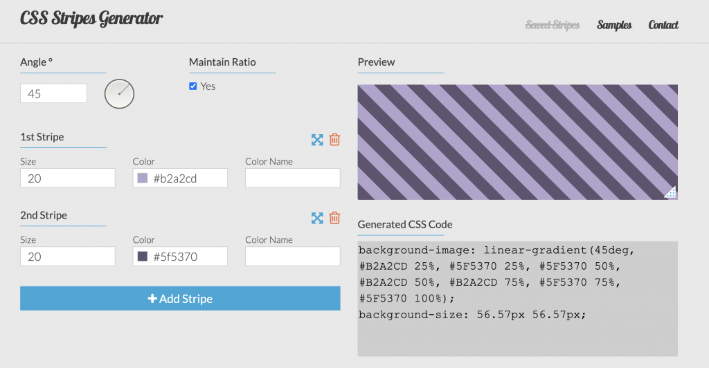 Now let’s play with the stripes! If you need an easy way to create a striped background, the Stripes Generator site is the place to make your life easier. You can add as many stripes as you want, and of course, change the color, orientation, and width for each one.