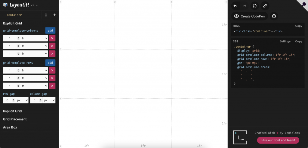 You can create a CodePen or grab the code to integrate it into your project when you have finished a layout.